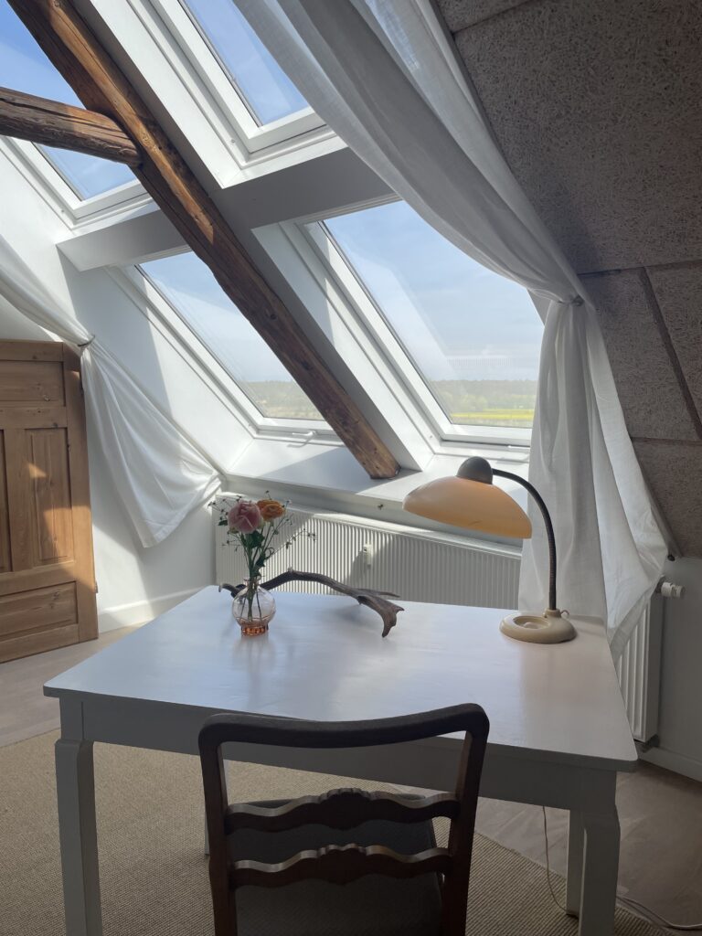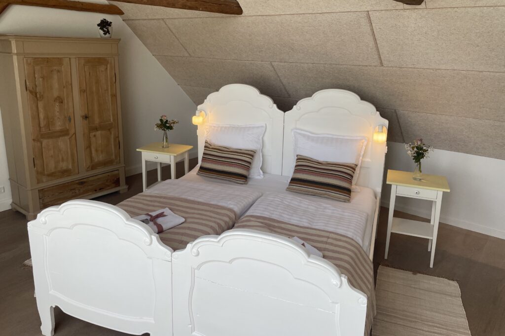 Sengen er 180 cm bred – lang nok til nutidens mennesker – og desuden udstyret med gode madrasser og topmadrasser. Derudover er sengetøjet luftet i vinden, og udsigten over markerne er intet mindre end betagende. Hvis du ønsker det, er der mulighed for at sidde og arbejde med den fantastiske udsigt som baggrund.